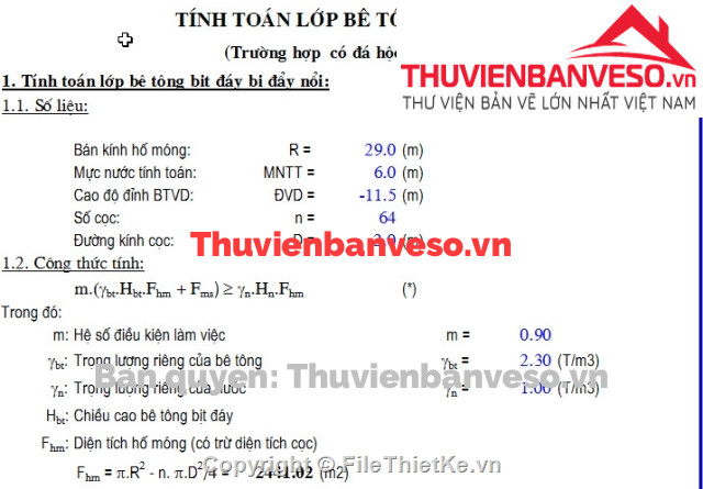 Gửi tới các bạn Bản tính toán lớp bê tông bịt đáy bằng Excel