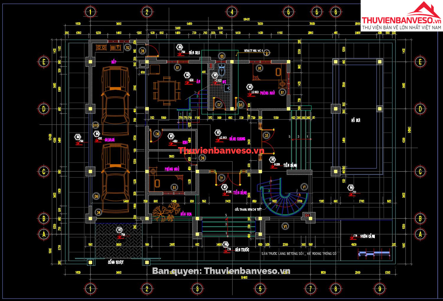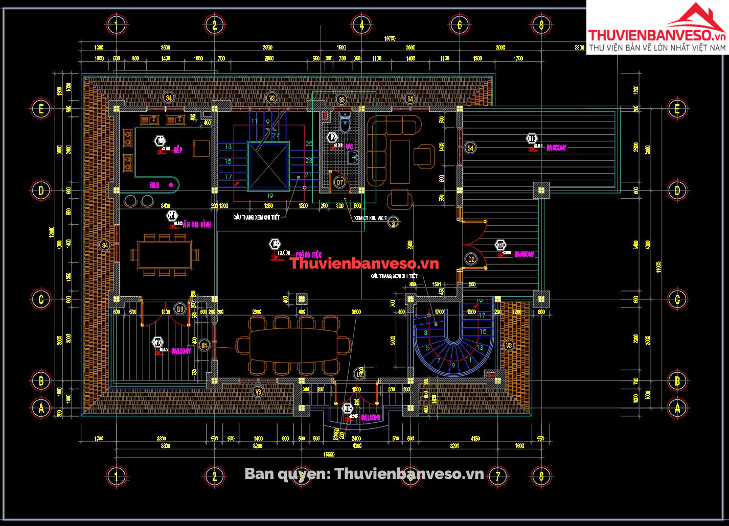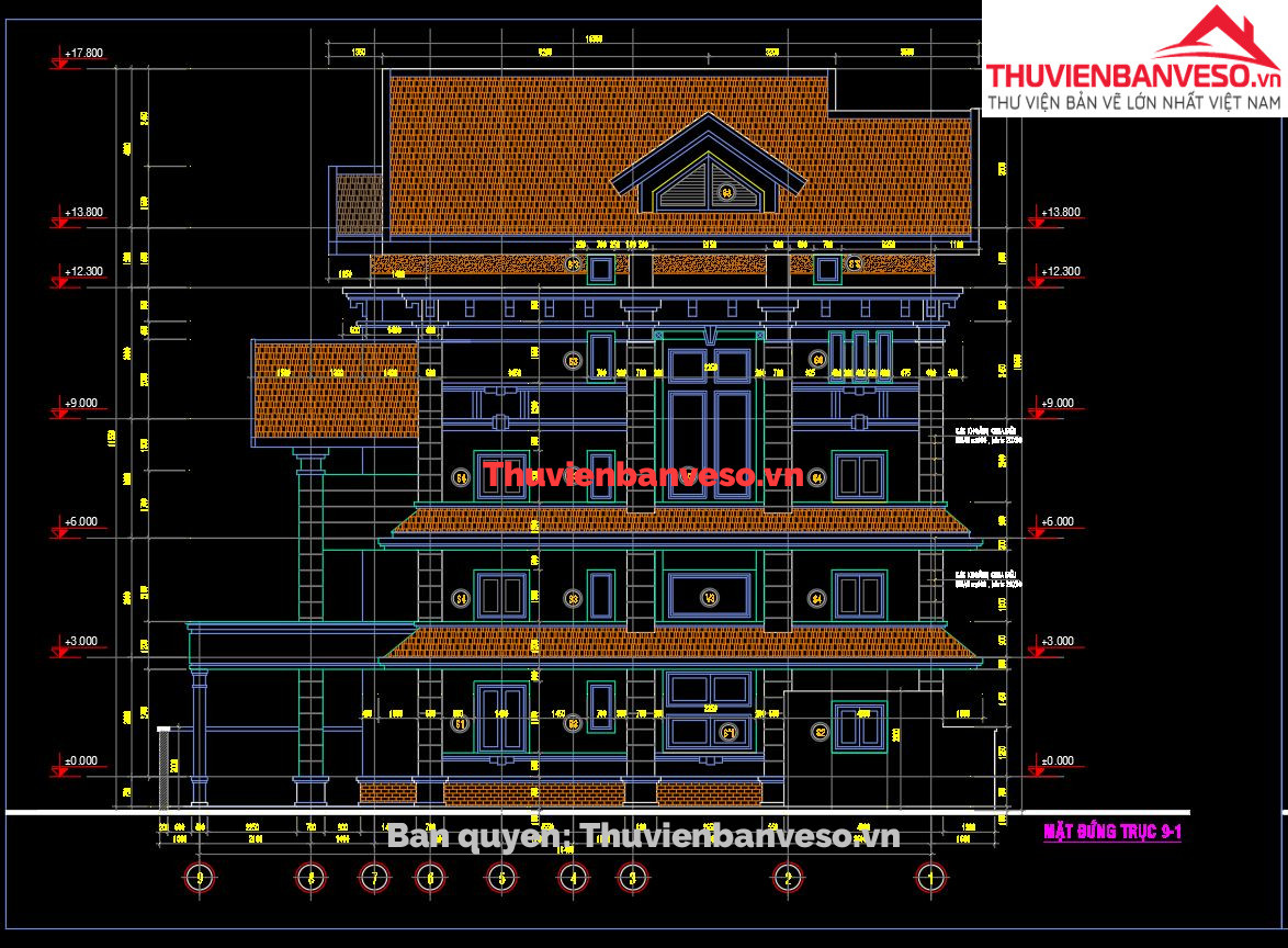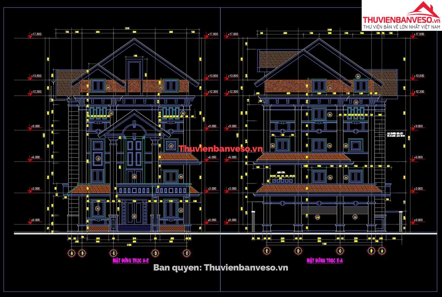 Bản vẽ kiến trúc thiết kế biệt thự, cao 4 tầng, kích thước 18x12m
