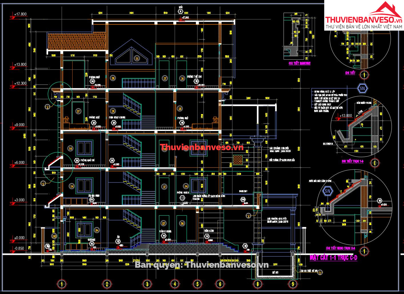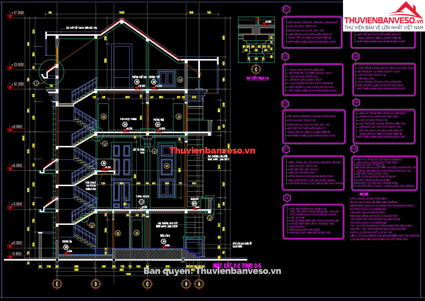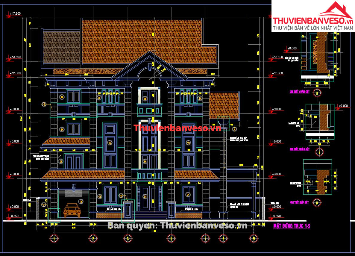 Biệt thự mái thái cao 4 tầng, 18x12m, có đầy đủ bản vẽ kiến trúc