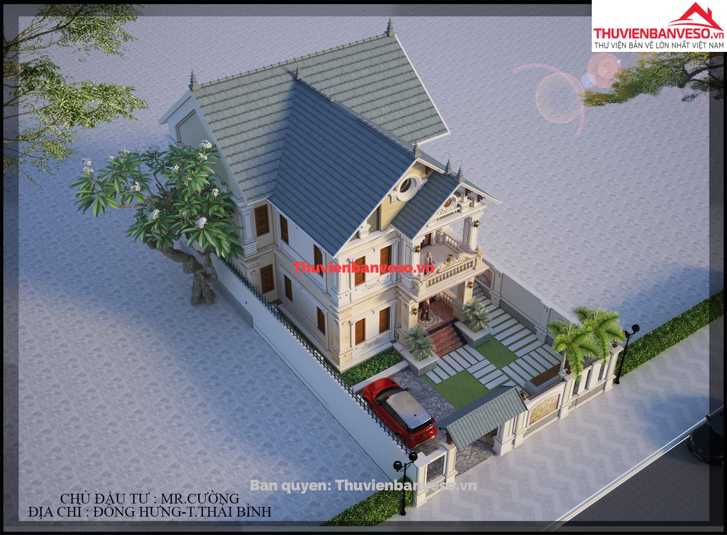 HSKTTC full các bộ môn kiến trúc,kết cấu,điện nước và ảnh 3d kiến trúc biệt thự mái thái 2 tầng