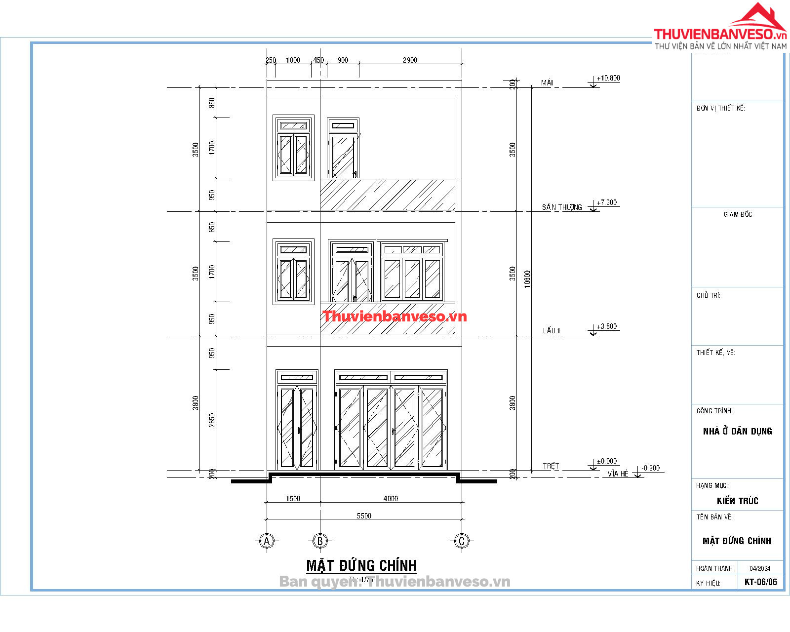 Bản vẽ Kiến trúc + Kết cấu Nhà phố 3 tầng 5.5x14m