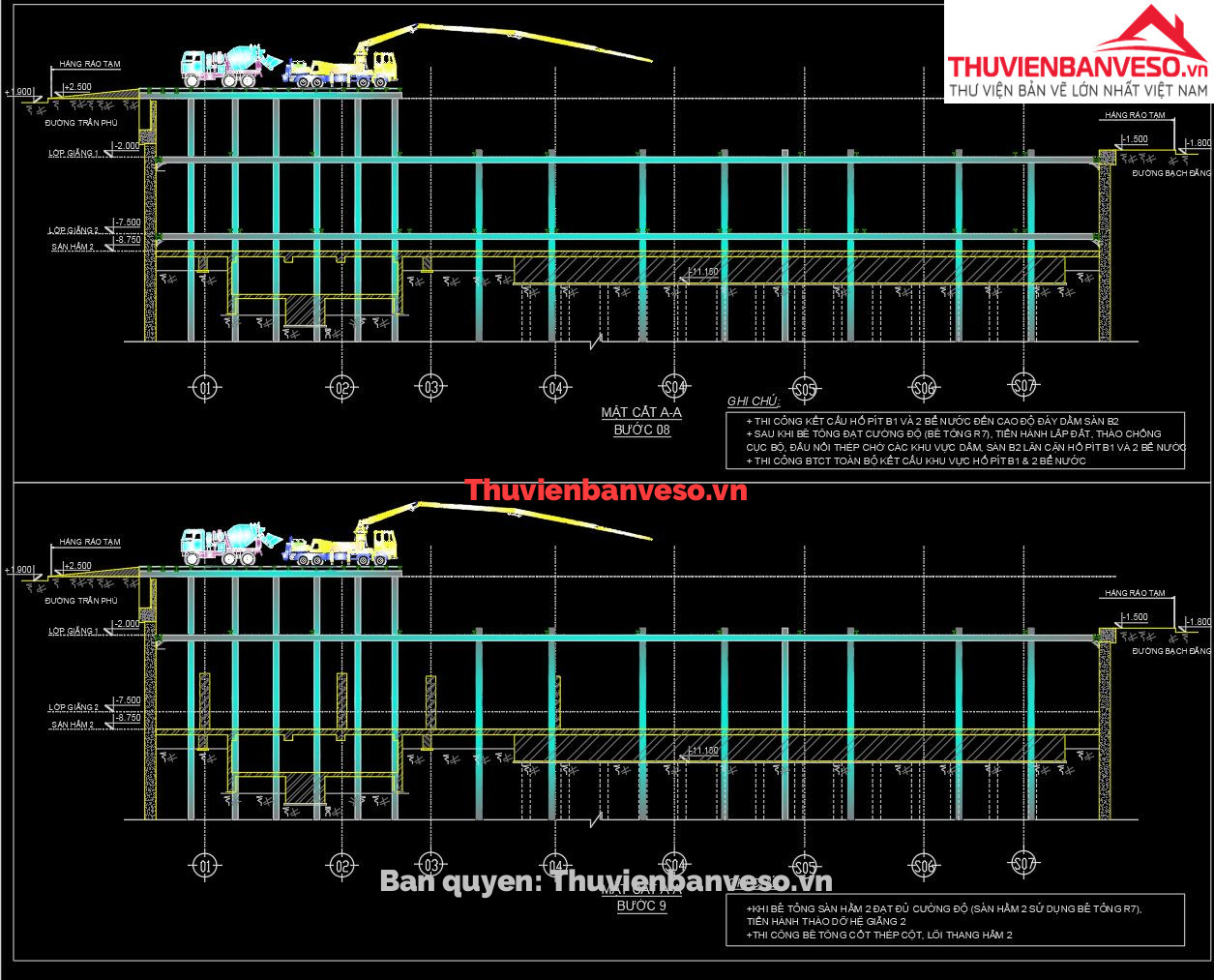 Đầy đủ bản vẽ các bước thi công móng, đào đất, tầng hầm, hạ mực nước ngầm...