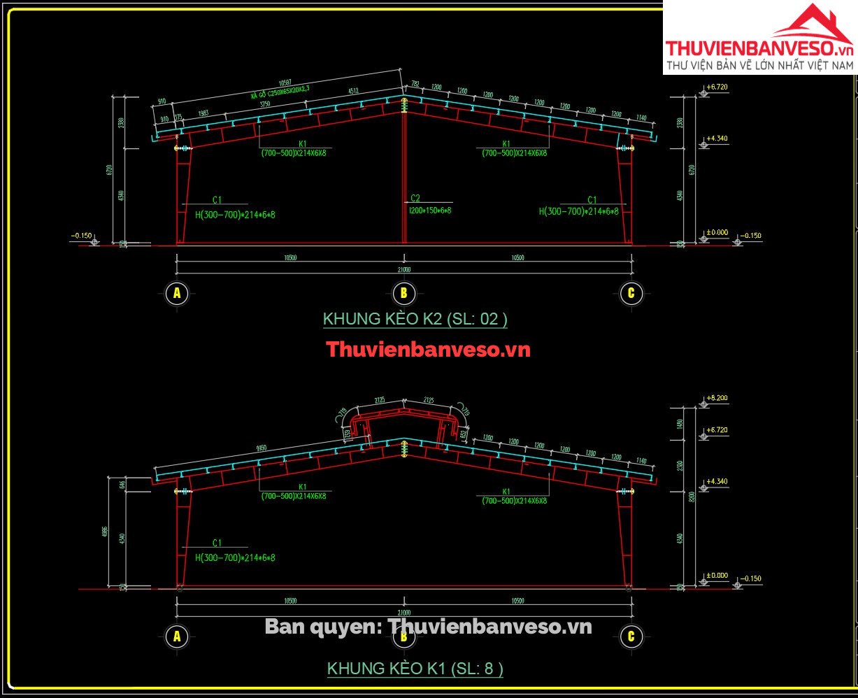 Bản vẽ nhà xưởng 1 tầng, chiều rộng 21m không cột giữa, chiều dài 72m, chiều cao giọt nước 5m