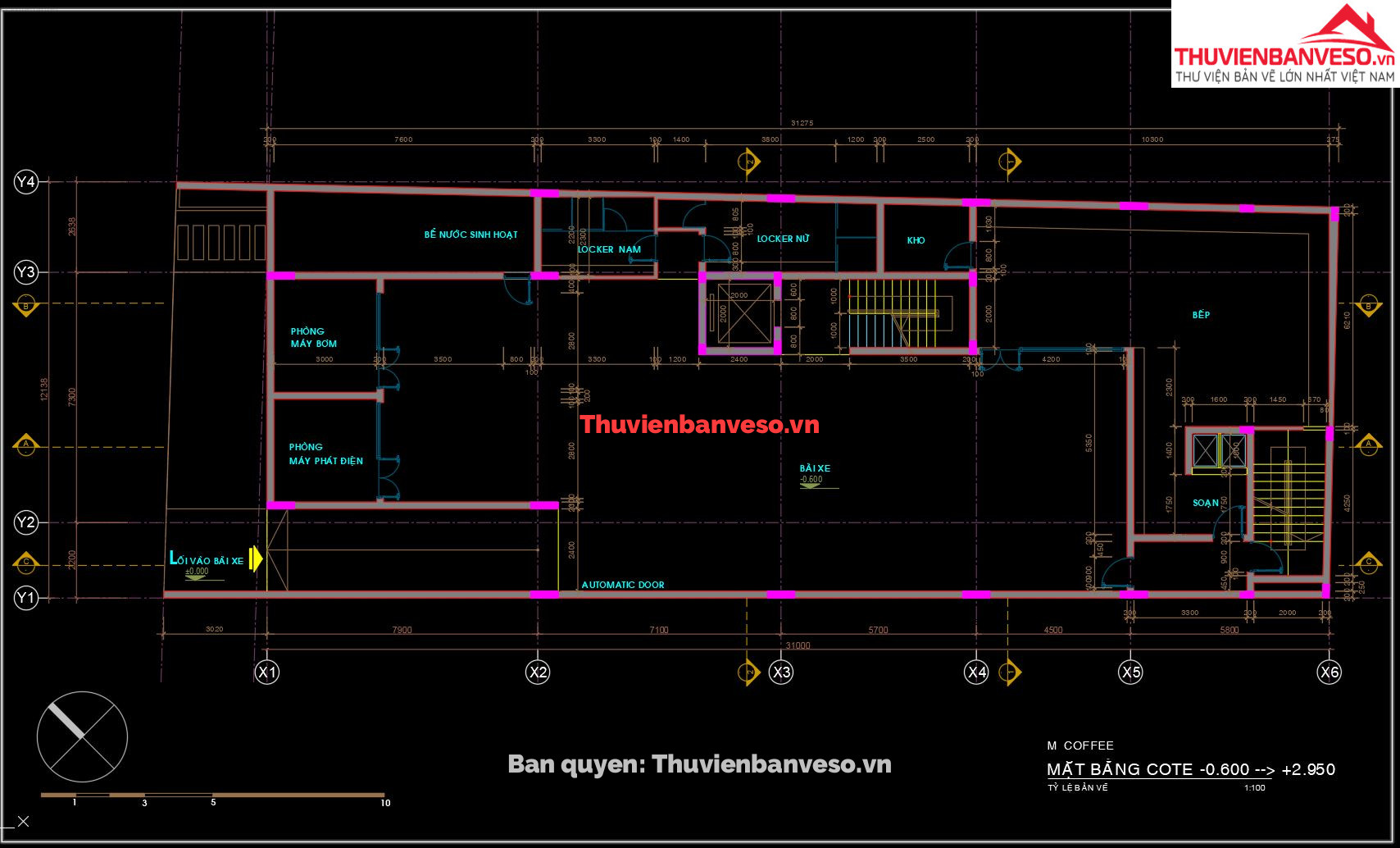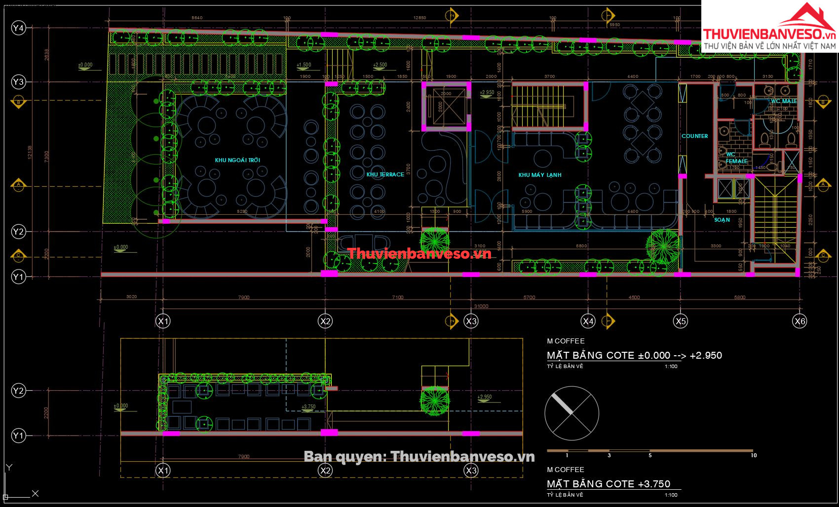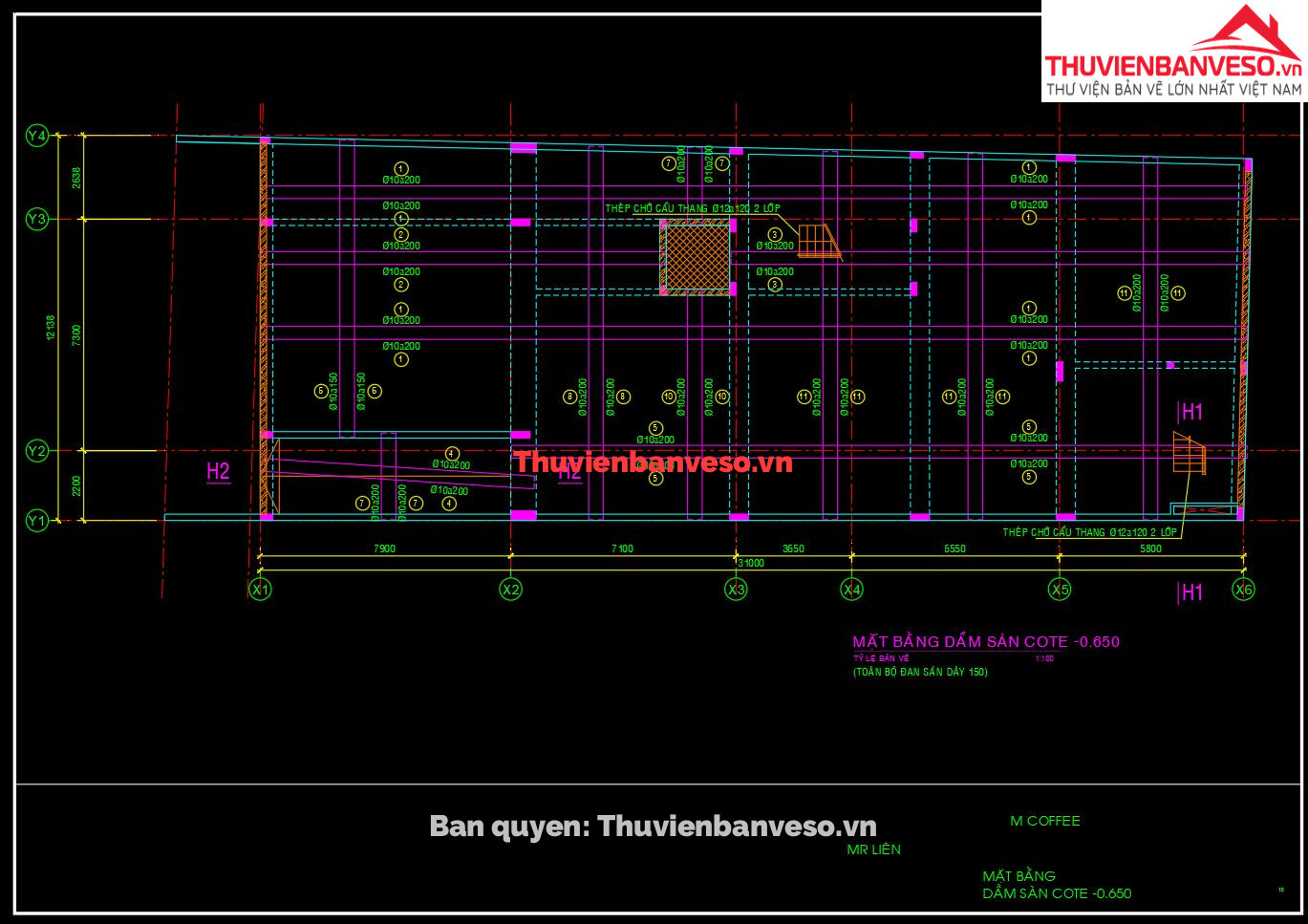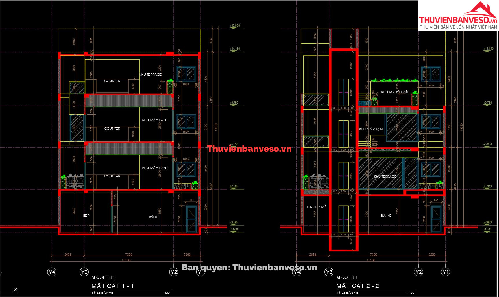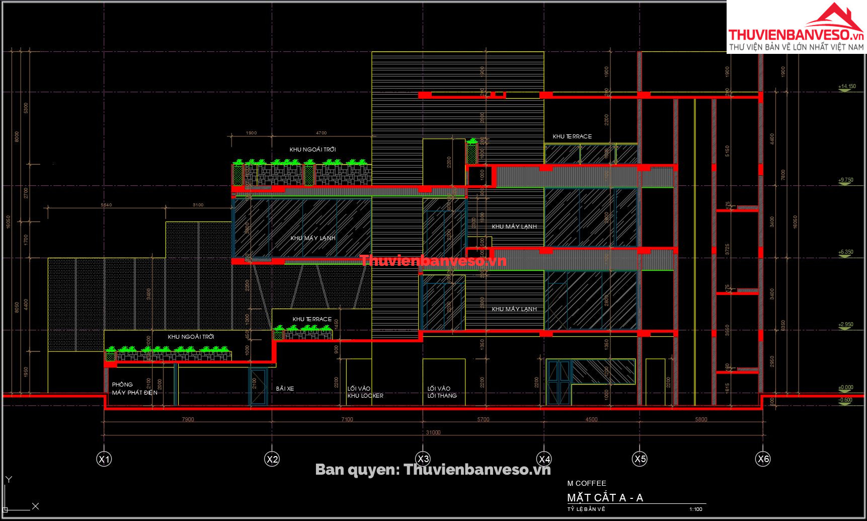 Bản vẽ thiết kế quán cà phê, 4 tầng, kích thước 31x12m, sử dụng kết cấu bê tông cốt thép